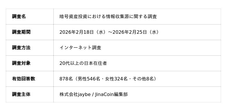 https://jinacoin.ne.jp/)は、20代以上の日本在住者878名を対象に、暗号資産投資における情報収集源に関するインターネット調査を実施しました。