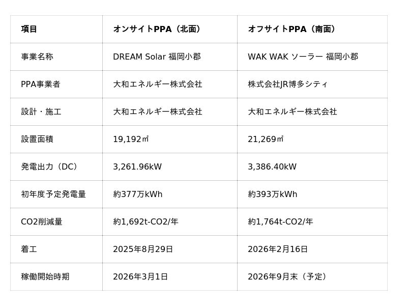 九州旅客鉄道株式会社(以下:JR九州)、株式会社JR博多シティ(以下:JR博多シティ)、大和エネルギー株式会社(以下:大和エネルギー)の3社は、物流施設「LOGI STATION福岡小郡」(福岡県小郡市)において、屋根を二分しオンサイトPPA方式(※1)およびオフサイトPPA方式(※2)という異なる2つのスキームにより、屋根全面を活用した太陽光発電を実現いたしました。