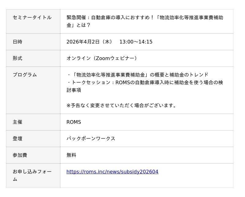 物流倉庫や工場向けに自動化ソリューションを提供する株式会社ROMS(本社:東京都品川区、代表取締役:前野洋介)は、『【緊急開催】自動倉庫の導入におすすめ!物流効率化等推進事業費補助金とは?』の開催を決定、お申し込みを開始しましたのでお知らせいたします。