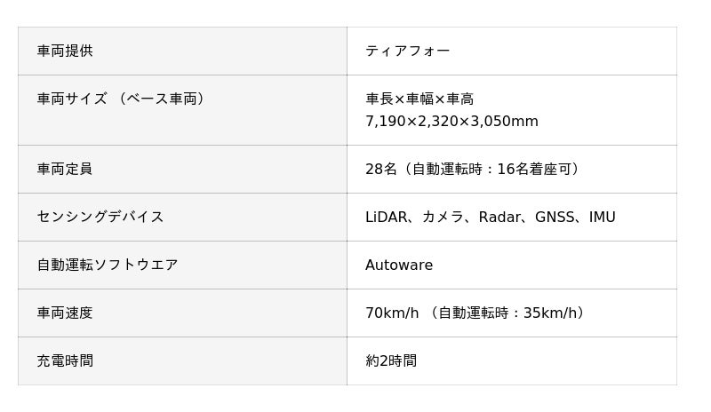 本実証で走行する車両は、日本政府が定める自動運転レベル4の基準に準拠し、電子制御ユニットや車両制御ユニットによってサポートされた、自動運転小型EVバスです。