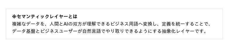 セマンティックレイヤーは、複雑なデータをビジネスの言葉へと翻訳し、指標・定義・関係性を統一することで、“意味の基盤”を整備する考え方です。生成AIの活用が進む今だからこそ、この「意味の整備」が企業競争力を左右すると私たちは考えています。