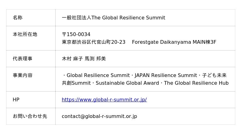 一般社団法人 The Global Resilience Summit は、「Road to 2030:レジリエンスを知のインフラへ」をビジョンに掲げ、日本および世界の行政・企業・学術機関・市民社会と連携しながら、レジリエンスとサステナビリティを両立させる社会OSづくりに取り組むプラットフォームです。