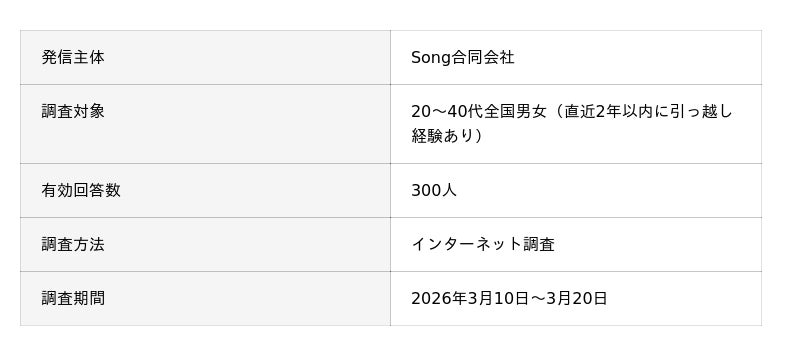 Song合同会社は、直近2年以内に引っ越し経験のある20~40代男女300名を対象に、「引っ越し後に発生するコスト連鎖」に関する調査を実施しました。 本調査では、見積り外の追加費用や引っ越し後30日間の支出、さらに二重払いなどの“固定費スリップ”の実態を明らかにしています。