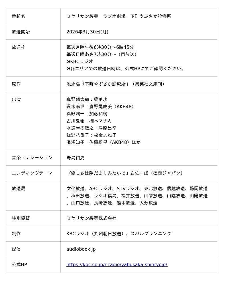 KBC九州朝日放送の新ラジオドラマ『下町やぶさか診療所』(池永陽原作:集英社文庫刊)が、いよいよ来週3月30日(月)よりスタートします。