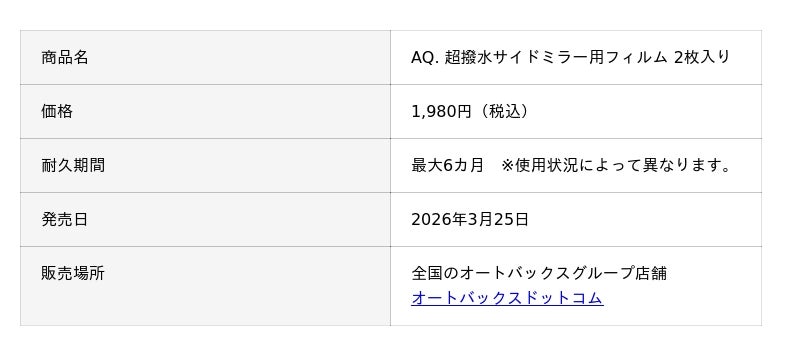 株式会社オートバックスセブン(代表取締役 社長:堀井勇吾)は、プライベートブランド「AQ.」(オートバックス クオリティ.)の新商品として、雨天時の運転の視界確保をサポートする『超撥水サイドミラー用フィルム』を、全国のオートバックスグループ店舗および