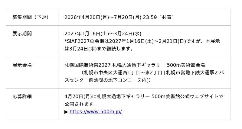 「500m美術館賞」は、札幌大通地下ギャラリー 500m美術館が毎年実施する現代アートの作品プランおよび企画プランのコンペティションです。2026年度は、SIAFと500m美術館が連携し「SIAF2027 500m美術館賞」と題した特別コンペティションとして実施します。本コンペティションで選出される2組は、芸術祭会期中、SIAF2027参加アーティストとして500m美術館を舞台に作品展示を行います。 多くの人が行き交う地下コンコースに設置されたガラスケース空間、その特性を生かした国内外からのプランをお待ちしております。