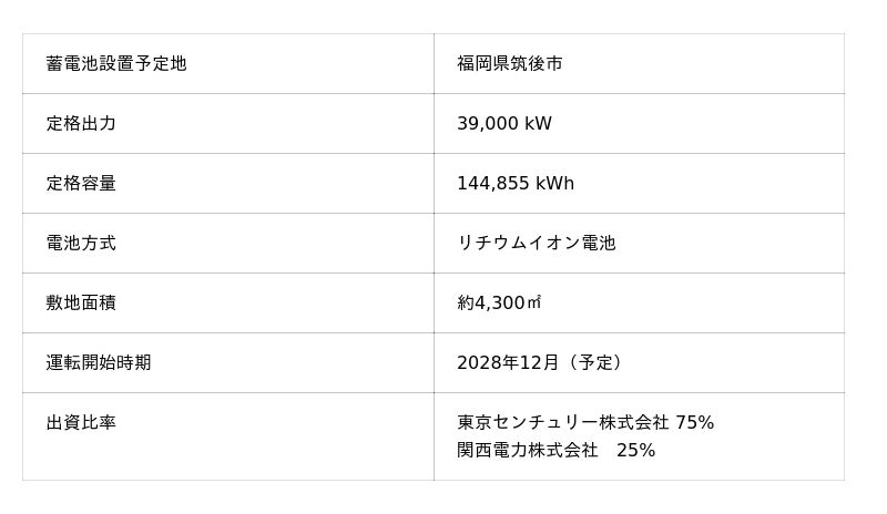 東京センチュリー株式会社(本社:東京都千代田区、代表取締役社長:藤原 弘治、以下「当社」)は、関西電力株式会社(本社:大阪府大阪市北区、取締役代表執行役社長:森 望、以下「関西電力」)と共同出資による福岡県筑後市での系統用蓄電池事業(以下「本事業」)の実施を決定しました。