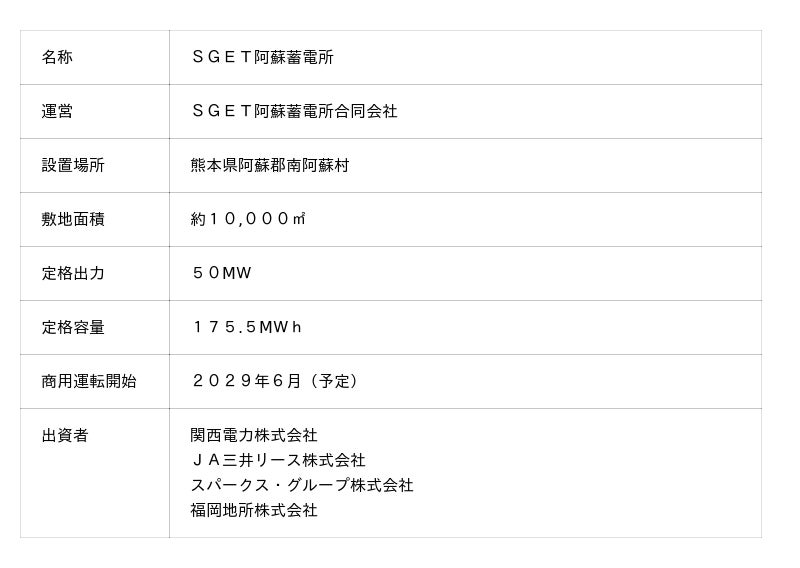 スパークス・グループ株式会社(以下、当社)および当社子会社のスパークス・グリーンエナジー&テクノロジー株式会社(以下、SGET)は、関西電力株式会社(以下、関電)、JA三井リース株式会社(以下、JA三井)、福岡地所株式会社(以下、福岡地所)とともに、熊本県阿蘇郡において蓄電所事業に参画します。