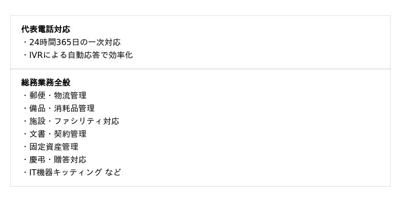 「総務まるっとサポートプラン」は、24時間365日の代表電話応対から、郵便・備品・固定資産管理といった現場作業までをカバー。フロント業務からバックオフィス業務まで、総務領域を包括的に代行するBPOサービスです。