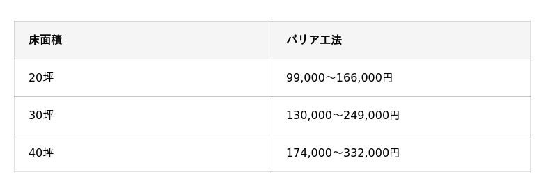 (床面積平方メートル )×(1平方メートル あたりの単価)=(バリア工法の施工費用)