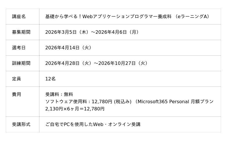 【Excel自動化 × Webアプリ開発】プログラミングが学べる求職者支援訓練「基礎から学べる!Webアプリケーションプログラマー養成科(eラーニングA)」4/28開講!受講生募集開始