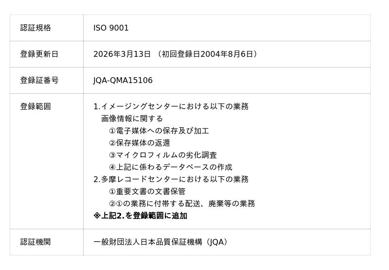 当社は、2004年に、画像情報に関する電子媒体への保存及び加工等において「ISO9001」の認証を取得して以来、20年以上にわたり厳格な品質管理を維持し、お客様の大切な情報の電子化・加工・媒体への保存のサービスを提供してまいりました。昨今、電子化業務とともに原本(紙文書)の保管まで一貫して受託するケースが増加していることを受け、文書保管プロセスにおいても品質マネジメントシステムを構築し、今回の認証範囲の拡大に至りました。これにより、原本(紙文書)の保管、必要に応じた電子化(媒体変換)、そしてデータ納品に至る全工程において、「ISO9001」に基づいた一貫性のあるサービスのご提供が可能となります。