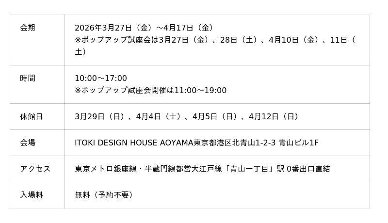 株式会社イトーキ(本社:東京都中央区、代表取締役社長:湊 宏司)は、2026年3月27日(金)から4月17日(金)まで、東京・青山の「ITOKI DESIGN HOUSE AOYAMA」にて、新作ワークチェア「SHIGA(シガ)」の体験イベントを開催します。