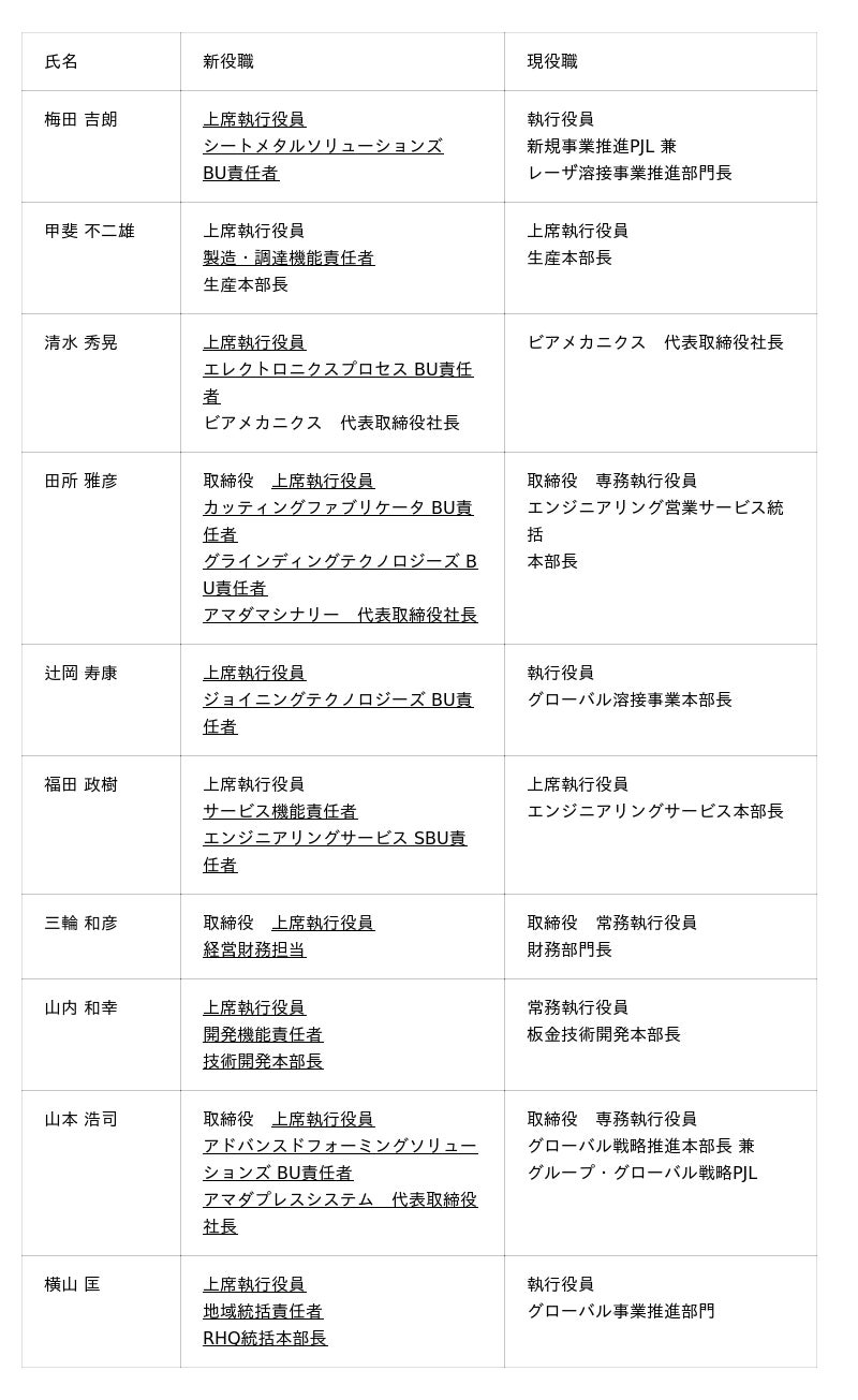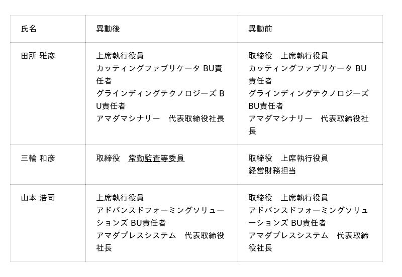 株式会社アマダ(神奈川県伊勢原市、代表取締役社長執行役員:山梨 貴昭)は、2026年度から始まる次期中期経営計画において、重要機能を担う執行役員の人事を決定したことをお知らせします。