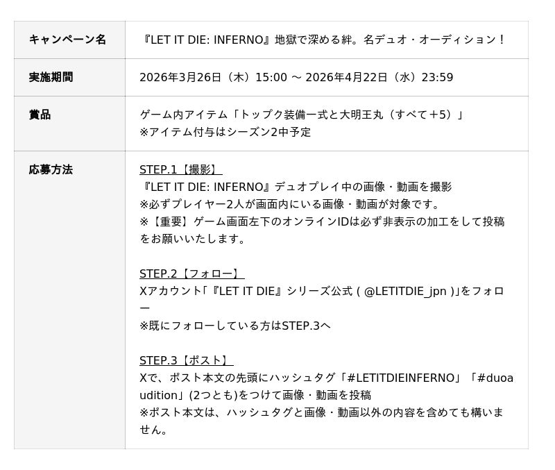 ガンホー・オンライン・エンターテイメント株式会社(本社:東京都千代田区、代表取締役社長 CEO 坂井一也)は、スーパートリック・ゲームズ株式会社(本社:東京都千代田区、代表取締役 石川周志)とタッグを組んで展開中のローグライトサバイバルアクションゲーム『LET IT DIE: INFERNO(読み:レットイットダイ インフェルノ)』において 、PlayStation(TM)Storeでの期間限定セール、およびユーザー参加型企画の開催をお知らせいたします。