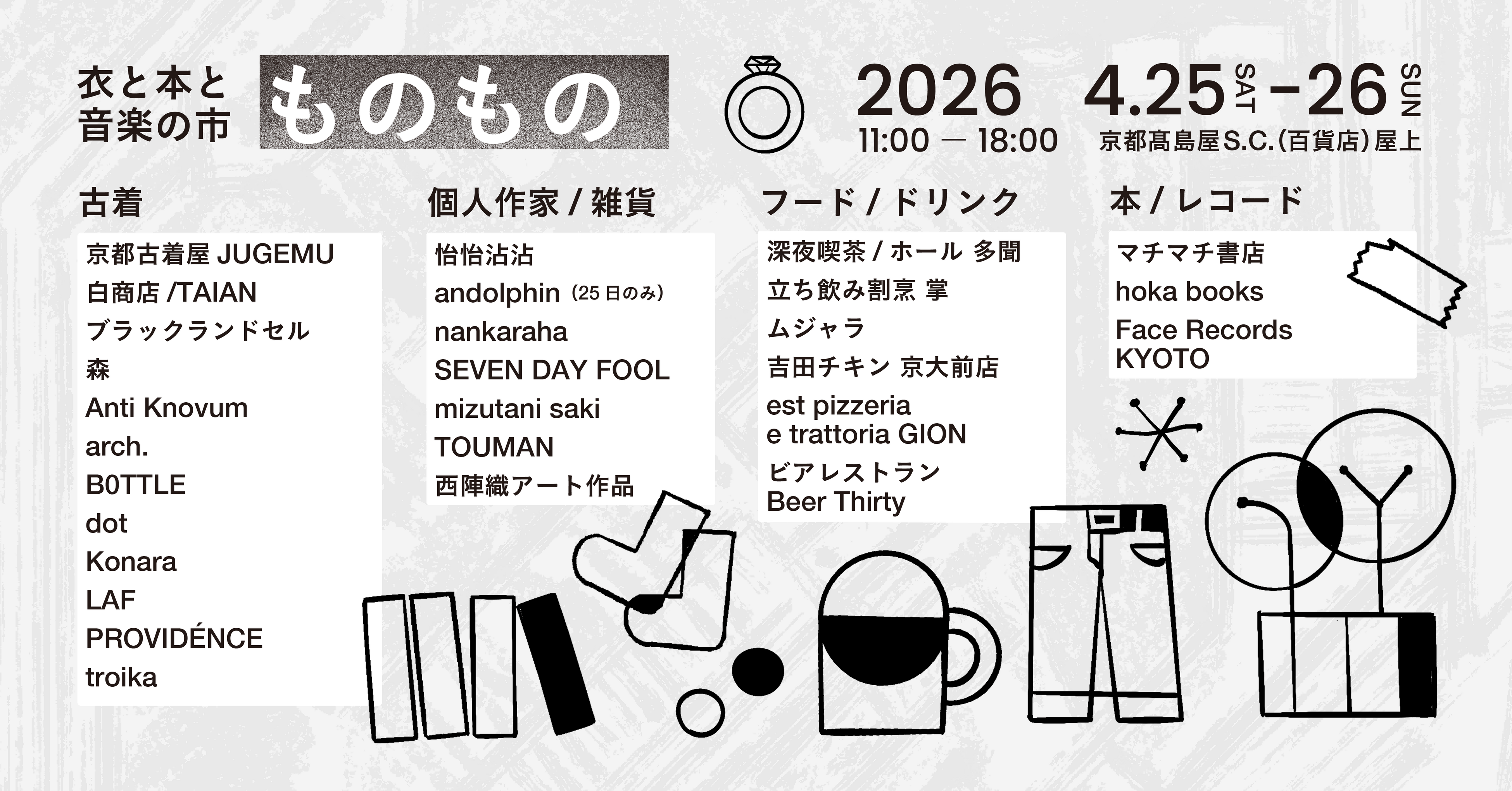 全国の古着屋が集まる「衣と本と音楽の市 ものもの」が、2026年4月25日(土)~26日(日)に京都高島屋S.C.(百貨店)屋上にて開催します。