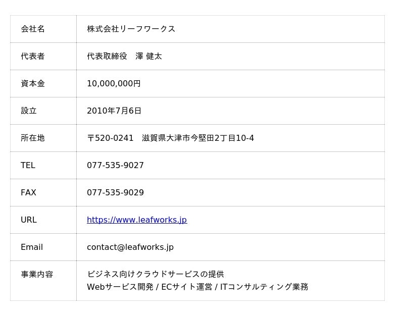 ビジネス向けクラウドサービスを提供する株式会社リーフワークス(本社:滋賀県大津市、代表取締役 澤 健太、URL