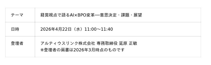 【アルティウスリンク】4/22(水) 「MAKE AI NEXT 2026 Spring」に登壇─AI×BPOがもたらすサービス構造の変化と、変革を実装につなぐ経営視点をご紹介
