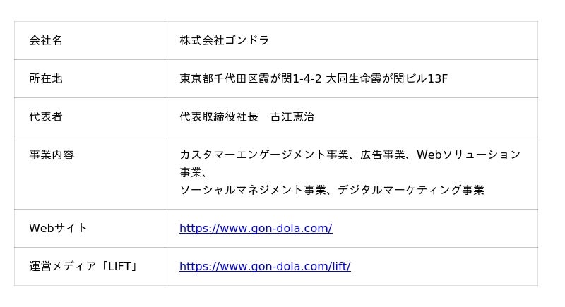 「LIFT」は、株式会社ゴンドラが運営する、未経験者から実務担当者、マネジメント層まで学べるマーケティングメディアです。未経験者にはマーケティングのキホンを、実務担当者、マネジメント層には課題解決のロジックとカスタマーエンゲージメントがわかる、当社独自のインタビュー記事をお届けします。