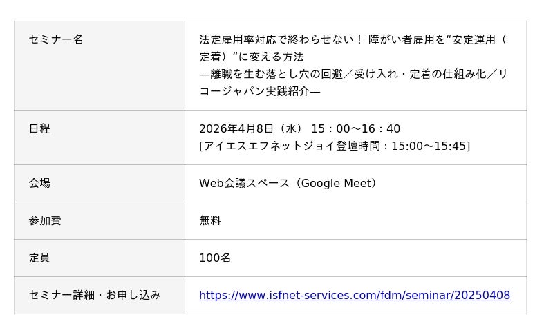 株式会社アイエスエフネットジョイ(本社:東京都新宿区、代表取締役:渡邉幸義、以下、アイエスエフネットジョイ)は、2026年4月8日(水)に、リコージャパン株式会社と共催セミナーを開催いたします。アイエスエフネットジョイは、「法定雇用率対応で終わらせない! 障がい者雇用を“安定運用(定着)”に変える方法」をテーマに登壇いたします。