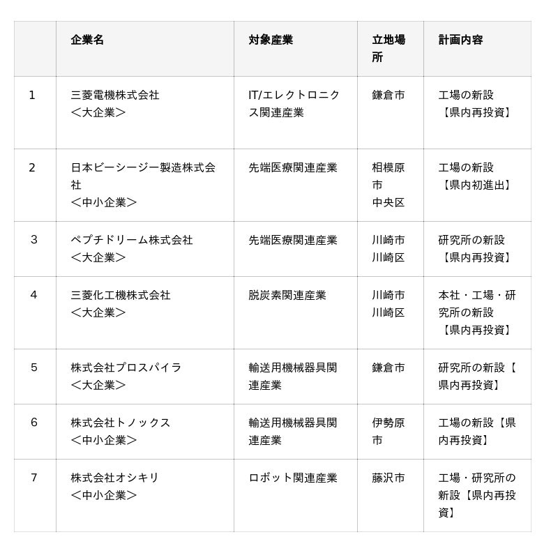 県では、企業誘致施策「セレクト神奈川NEXT」により企業の立地を支援しています。 このたび、この支援制度を利用して、三菱電機株式会社など7社が工場等を新設することになりましたので、お知らせします。