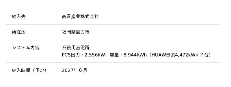 本件は、高沢産業が運用事業者となる「系統用蓄電所」(容量約8.9MWh)の設置工事を受注したものであります。「系統用蓄電所」とは、電力の送電網に直接接続される蓄電池のことで、再生可能エネルギー発電所の普及等により、不安定となる電力系統の安定化を目的として設置されます。テス・エンジニアリングは、2014年に高沢産業へ太陽光発電設備を納入しており、その後のメンテナンス等を通じた継続的な関係性をきっかけとして、本件の成約に至りました。本件についても、納入後にテス・エンジニアリングがメンテナンスを担うほか、24時間遠隔監視及び運用管理(アグリゲーション)業務を実施する予定であり、長期安定的な運用に貢献してまいります。