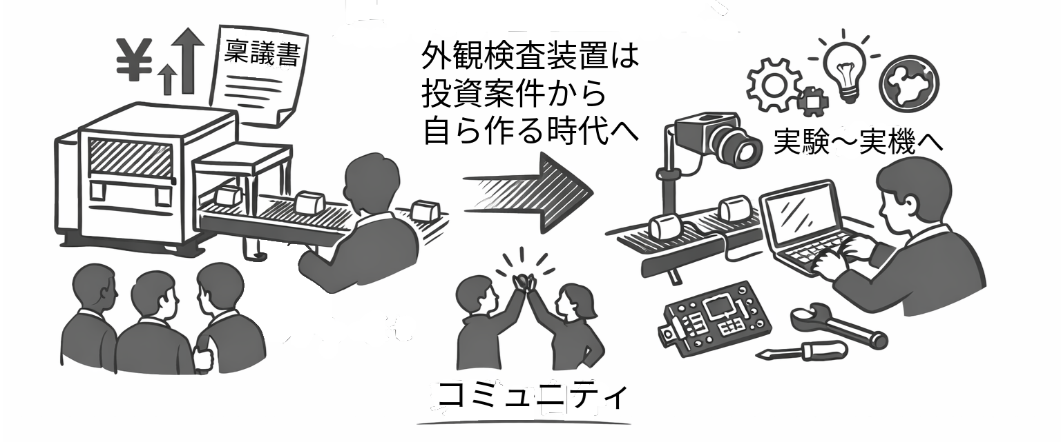 これまでの外観検査は、稟議を上げ、仕様を固め、メーカーの仕様に合わせる形で進むことが少なくありませんでした。OpenAA(R)はその流れからの解放を目指します。