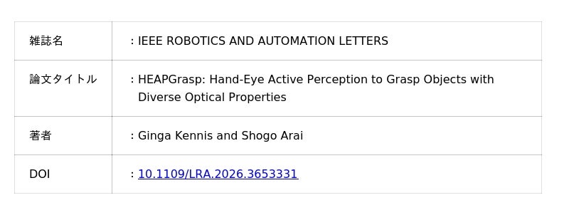国際学術誌「IEEE ROBOTICS AND AUTOMATION LETTERS」にオンライン掲載されました。また、本成果はロボティクス分野のトップカンファレンスである2026 IEEE International Conference on Robotics & Automation(ICRA 2026)にて発表予定であり、世界的な注目を集めています。