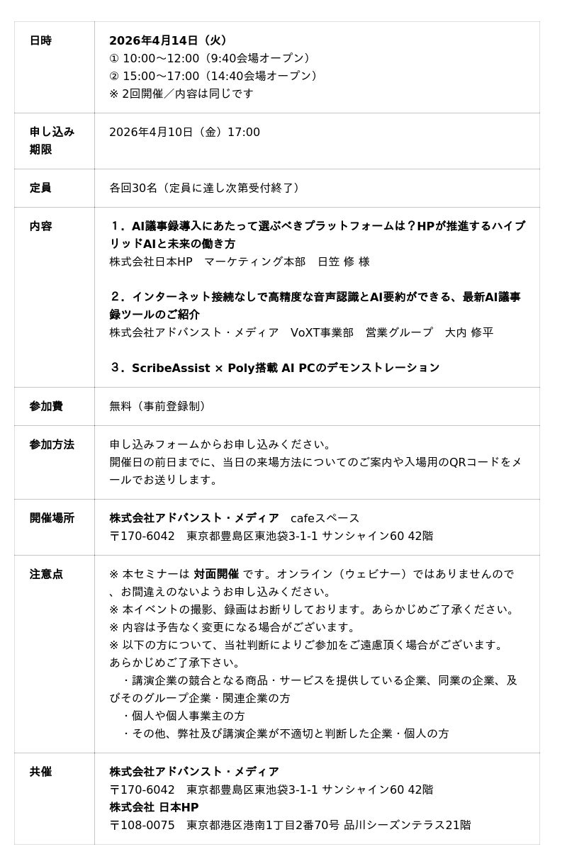 2026年4月14日(火)、株式会社アドバンスト・メディア(本社:東京都豊島区、代表取締役会長兼社長:鈴木清幸 以下、アドバンスト・メディア)は、「AmiVoice×AI PCで実現する未来の働き方─最新のAI議事録ツールを次世代AI PCで体験」を共催いたします。
