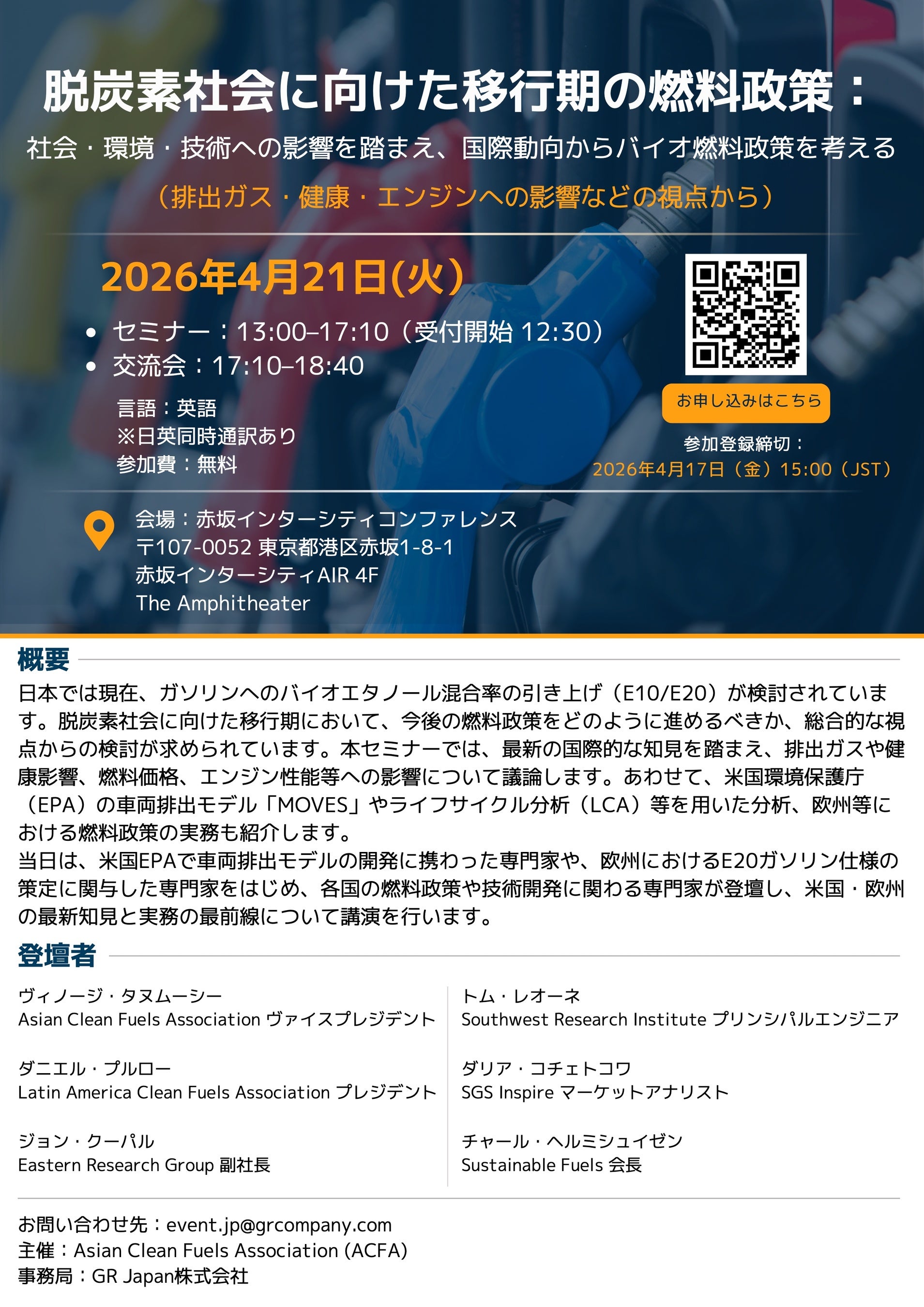 クリーンで効率的な燃料供給を通じた大気質の改善や脱炭素化を推進する非営利団体Asian Clean Fuels Association*(ACFA)は、バイオ燃料の国際動向や燃料政策の方向性をテーマとしたセミナーを、4月21日(火)に、東京・赤坂にて開催いたします。