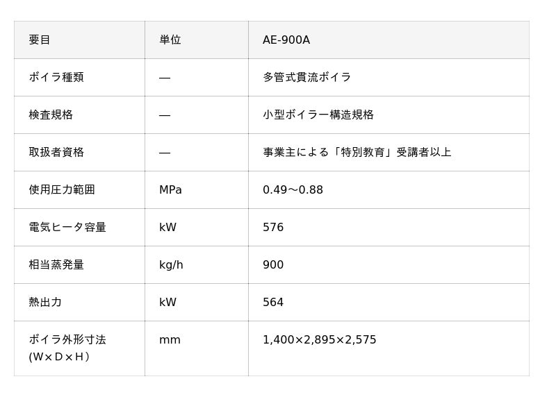 本製品を扱う場合、「ボイラー技士」の資格が不要で、事業主による「特別教育」受講者以上であれば操作が可能です。また大型ボイラ※3と比べて保有水量が少なく、短時間で蒸気供給が可能です。