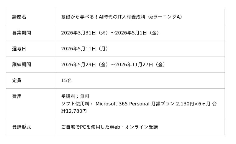 【自宅でオンライン学習】プログラミングが学べる求職者支援訓練「基礎から学べる!AI時代のIT人材養成科(eラーニングA)」5/29開講!受講生募集開始