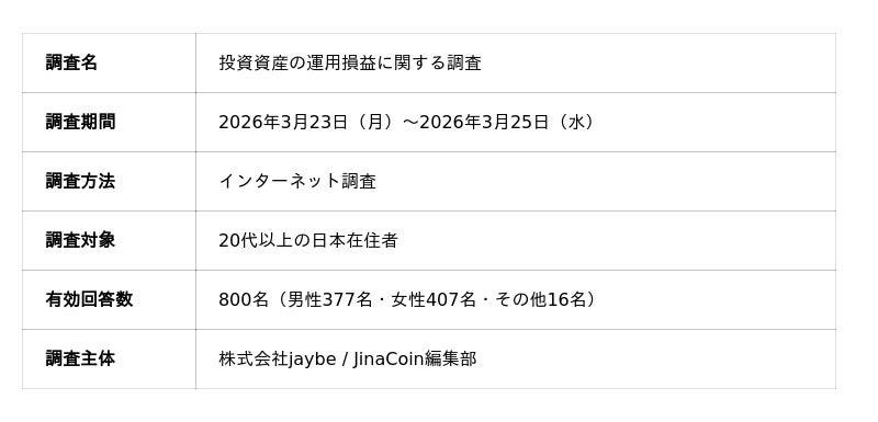 https://jinacoin.ne.jp/)は、20代以上の日本在住者800名を対象に、投資資産の運用損益に関するアンケート調査を実施しました。