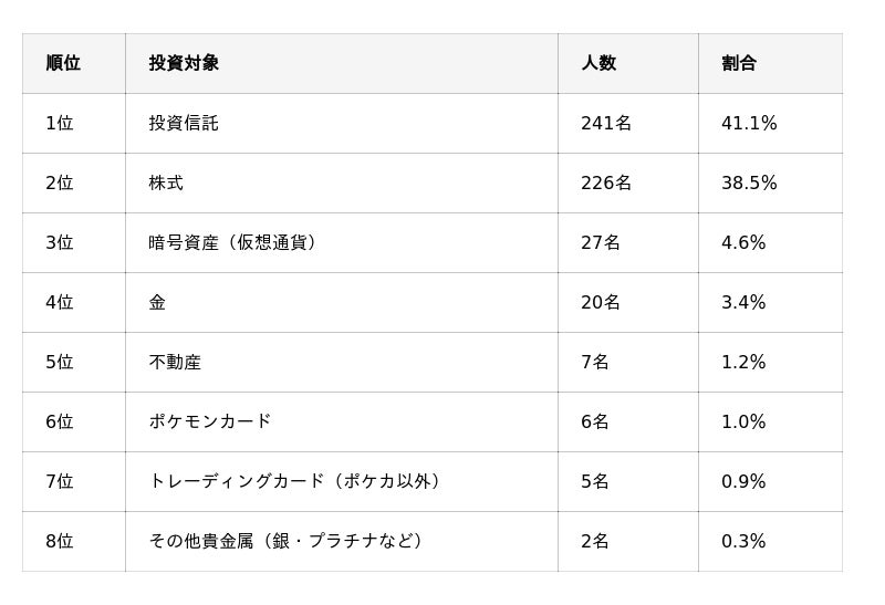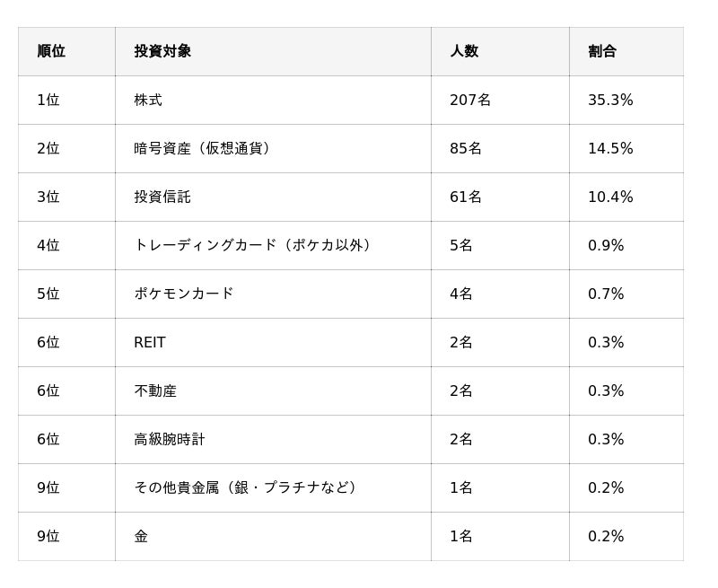 投資信託と株式で全体の約8割を占めており、3位の「暗号資産」(4.6%)以下とは大きく差が開く結果となりました。投資信託や株式で利益を得ている層が圧倒的に厚い実態がうかがえます。