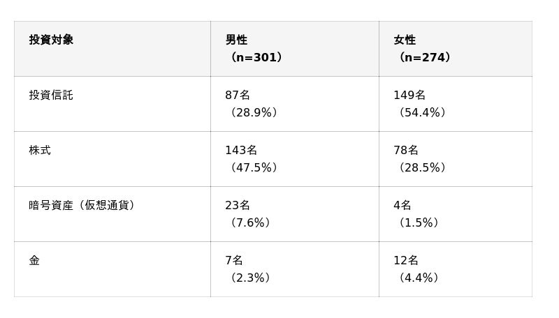 男女別にみると、男性は「株式」、女性は「投資信託」がそれぞれ1位となりました。