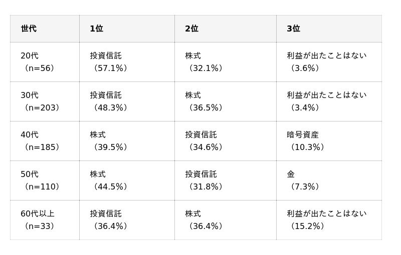 20代・30代は「投資信託」、40代・50代は「株式」が利益の主軸に