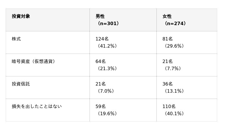 男性は「株式」(41.2%)が1位、次いで「暗号資産(仮想通貨)」(21.3%)が2位となりました。対して女性は「損失を出したことはない」(40.1%)が最多となり、2位の「株式」(29.6%)を大きく上回っています。