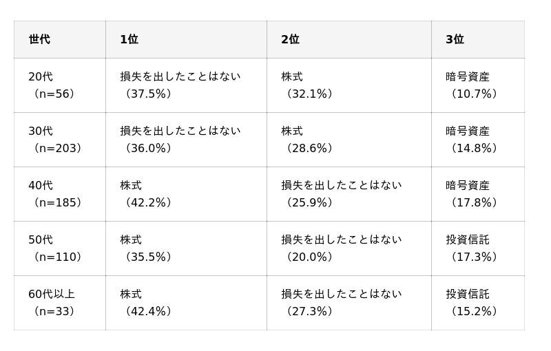 20代・30代は「損失なし」が最多、40代以降は「株式」が損失1位に