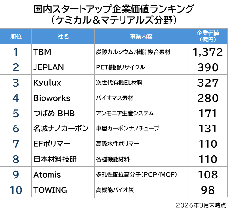 https://www.jmtc.co.jp/webinar/)を通じた情報発信も行っています。今回、「スピーダスタートアップ情報リサーチ」の情報をもとに、2026年3月末時点での、ケミカル&マテリアルズ分野における国内スタートアップについて企業価値ランキングを作成し、公表いたしました。