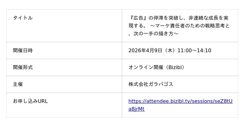 AIを活用した広告クリエイティブ制作・運用サービス「AIR Design」を展開する株式会社ガラパゴス(本社:東京都港区、代表取締役:中平健太)は、2026年4月9日(木)にオンラインカンファレンス『「広告」の停滞を突破し、非連続な成長を実現する。 ~マーケ責任者のための戦略思考と、次の一手の描き方~』を主催することをお知らせいたします。