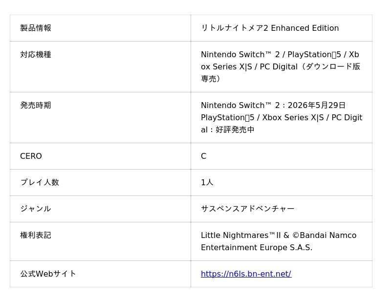 株式会社バンダイナムコエンターテインメントは、サスペンスアドベンチャーゲーム『リトルナイトメア2 Enhanced Edition』につきまして、ダウンロード版専売でNintendo Switch(TM) 2にて2026年5月29日(金)に発売することを発表いたしました。オリジナル版から強化したグラフィックと立体音響でゲームプレイをお楽しみいただけます。