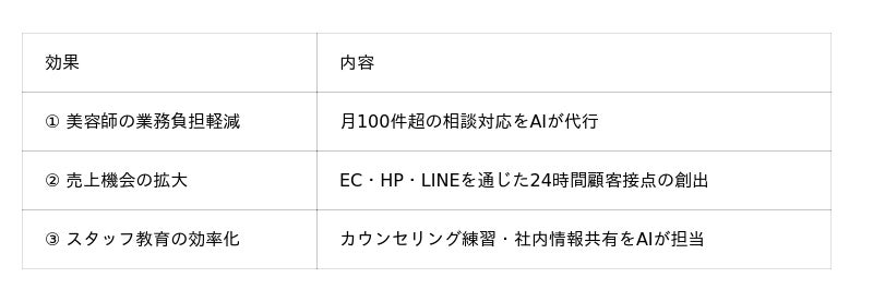 - 全国からの潜在顧客・悩み相談対応月100件以上寄せられていた深い悩み相談を、スタイリスト自身の知見を学習させたAIが代行。毎日多くの時間を費やしていた対応負荷が大幅に軽減された。- EC連携によるパーソナライズ提案ヘアケア情報を学習させたAIがECサイト上で髪の状態や悩みに応じたアイテムを提案。来店経験のない全国のユーザーへも個別対応が可能になり、髪質改善の底上げにつながっている。- LINE公式アカウントとの24時間連携各店舗のLINE公式に全店舗情報を学習させたAIを紐づけ、これまで手動対応していた顧客連絡を24時間対応可能に。顧客・スタッフ双方のスピード感が向上した。- 社内規定・方針の即時回答社内規定や施術情報を学習させたAIを設置することで、スタッフが疑問を感じた際に上司へ連絡する前にAIで解決できるようになり、情報確認のスピードが上がった。- カウンセリング教育への活用採点基準と多数のお客様像を学習させたAIにより、スタッフが気軽にカウンセリングの練習とフィードバックを受けられる環境を構築。全スタッフの接客品質向上に貢献している。- HPを通じた予約前の悩み相談対応HPに紐づけたAIが、予約検討段階の潜在顧客の悩みに対応。来店につながる接点を24時間作り続けている。