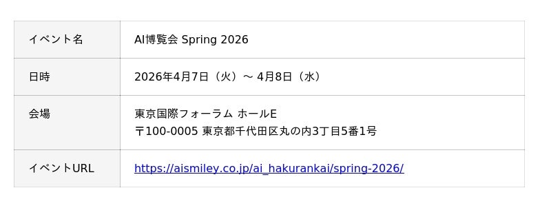 「AI博覧会 Spring 2026」 は、AI導入を加速させるためのイベントです。