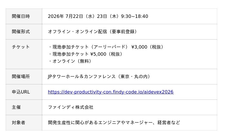 エンジニアプラットフォームを提供するファインディ株式会社(東京都品川区、代表取締役:山田 裕一朗、以下「当社」)は、2026年7月22日(水)と7月23日(木)に開催する第4回目となる「AI DevEx Conference 2026 - Future of Development Productivity -」(旧:開発生産性Conference)の申込受付を4月6日(月)より開始しました。