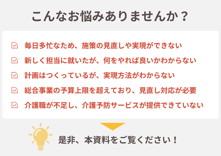 一方で、職員や地域包括支援センターの業務負担は増大しており、多くの自治体は「毎日多忙なため、施策の見直しや実現ができない」「総合事業の予算上限を超えており、見直し対応が必要」「介護職が不足し、介護予防サービスが提供できていない」といった深刻な課題を抱えています。