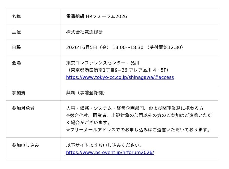 テクノロジーで企業と社会の進化を実現する株式会社電通総研(本社:東京都港区、代表取締役社長:岩本 浩久、以下「電通総研」)は、2026年6月5日(金)に東京コンファレンスセンター・品川にて、人事・HR領域のカンファレンス「電通総研 HRフォーラム2026」を開催します。