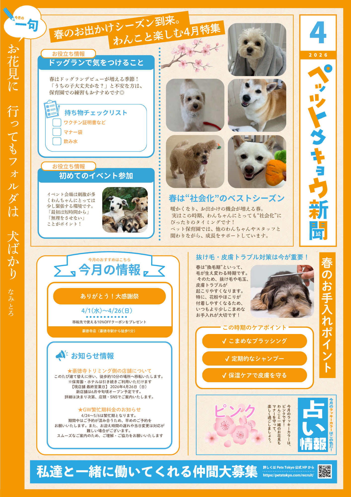 「ペッツトウキョウ新聞」は、ペットとの暮らしをより楽しく、より快適に過ごすためのヒントをお届けする月刊情報誌です。4月号では、春のお出かけ特集記事を掲載しております。