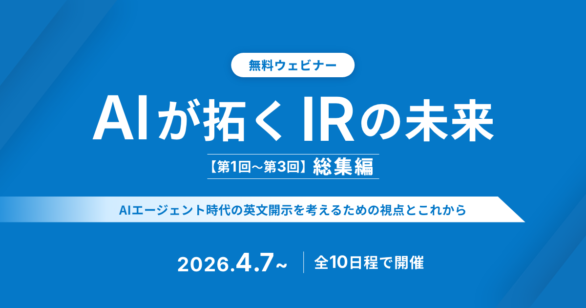 2026年4月7日より10日程で、総集編を開催することが決まりました。「AIが拓くIRの未来」シリーズ第1回~第3回の対談から高評価のポイントを厳選し、AIエージェント時代の英文開示を考える視点を提示します。