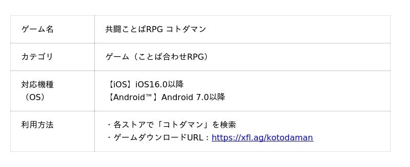 スマートフォンで遊べる「ことば」で闘う新感覚RPGです。文字の精霊「コトダマン」を組み合わせて「ことば」をつくり、ステージクリアを目指します。つくった「ことば」の長さや数で敵に与えるダメージが変化し、最大4人で協力しながら遊ぶマルチプレイでは、友だちや家族とワイワイ盛り上がりながら、それぞれの知識を出し合って「ことば」づくりを楽しむことが可能です。生き物、食べ物、地名、歴史上の人物から、流行のあの「ことば」まで、29万語以上に対応。「ことば」は日々追加しており、無限に楽しみが広がる、究極のことば遊びゲームです。2025年10月時点で、累計利用者数600万人を突破しています。