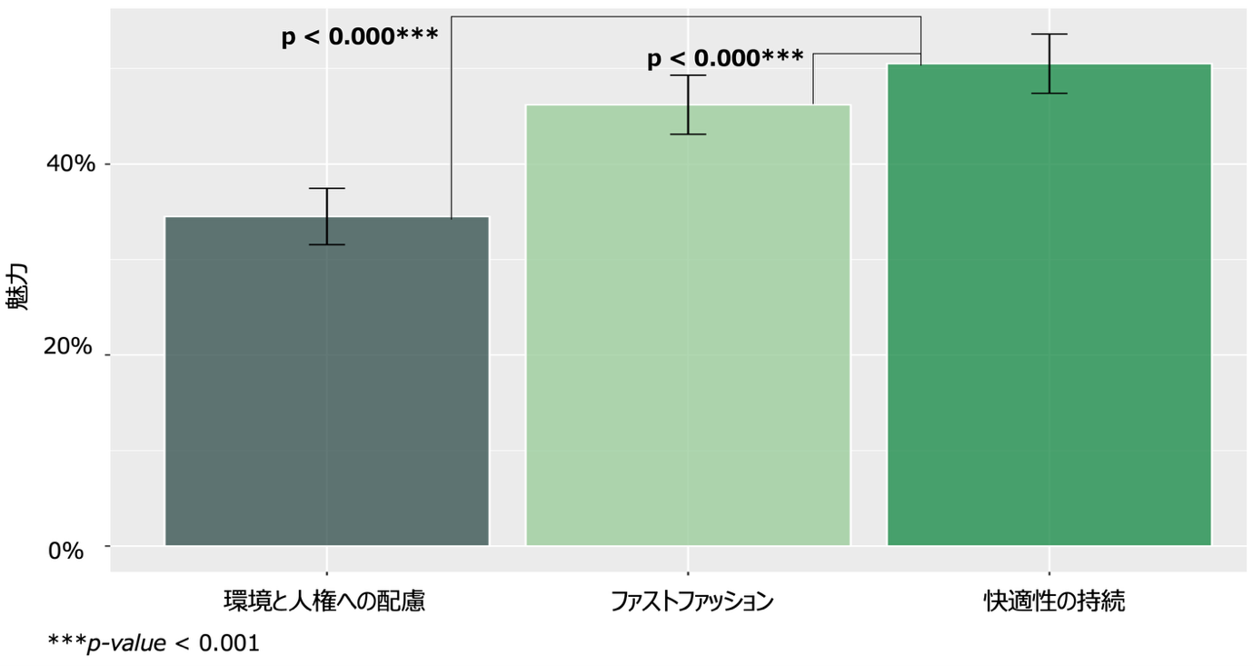- 消費者は、企業の社会的責任に対する認識を重視する姿勢を見せながら、実際には購入行動に移さない傾向があります。この傾向は、多くの業界で観測されており、ファッション業界でも共通です。安価で、かつ豊富な選択肢を提供してくれるファストファッションは急成長しました。その反面、安価なファストファッションの普及は大量消費・大量廃棄を産み、環境問題の悪化が懸念されています。- 図1に示すとおり、Study 1では日本人女性600名を対象としたオンライン調査結果に基づき、ファッションのロイヤルティの要因を共分散構造分析で分析しました。その結果、快適性が最も強い正の効果を持ち、次いでデザイン性、経済性が続きました。一方、サステナビリティ(環境保護・人権保護)はロイヤルティに対して負の効果を示しました。また、ファッションという半耐久財にもかかわらず、耐久性は有意な効果を持っていないことが確認されました。つまり、消費者はファッションを「消耗品」として捉え始めている懸念を示唆しています。- 経済成長と環境配慮を両立するためには、ファッションを半耐久財に引き戻す価値づくりが求められます。従来のサステナビリティは、環境・人権の保護を訴求してきましたが、それは利他的動機であり、消費者は価値を感じにくくなります。環境や人権に配慮した商品を購入する行動であるエシカル消費を促進するためには、利己的動機に基づいてエシカル特性を消費者価値に転換する必要があります。- Study 1の結果、ファッションにおいては、肌触りなどの快適性が最も重視される利己的動機であることが判明しました。しかし、衣服は繰り返しの洗濯により快適さが容易に失われ、消費者が衣服を大切にしなくなる一因となっています。そこで本研究では、「快適性の持続」というコンセプトを策定しました。これは、長期間にわたり快適さを維持する衣服が、機能的に長く使用可能なだけでなく、衣服への愛着を育み、結果として衣服の購入量や廃棄量の削減につながるという、消費者価値と環境・人権保護を両立させる新しいサステナビリティの形です。従来のサステナビリティが環境保護や人権保護という利他的動機を中心に訴求していたのに対し、本概念は消費者自身の価値を起点としたサステナビリティになっています。- Study 2では、20~60歳の日本人3000名を対象にランダム化比較試験を実施しました。被験者は、(1)環境・人権保護(従来型サステナビリティ、図2)、(2)ファストファッション(図3)、(3)快適性の持続(新しいサステナビリティ、図4)の3群にそれぞれ1,000名ずつ無作為に割り当てられ、各コンセプトシートを提示された後に魅力度を評価しました。その結果、「快適性の持続」の魅力度は50.5%と最も高く、ファストファッション(46.2%)および従来型サステナビリティ(34.5%)を有意に上回りました。この結果は、消費者の利己的動機に基づくサステナビリティ概念が、低価格を武器とするファストファッションをも凌駕する商品魅力を持つことを示唆しています。エシカル消費の普及には、直接的に環境配慮や消費量の削減を訴求するのではなく、消費者価値の最大の源泉である肌触り等の快適性が持続する商品を訴求し、それが結果として消費量削減に貢献するという位置付けにすべきです。